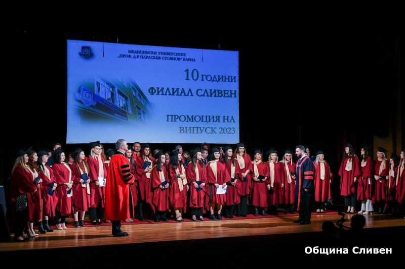 Под звуците на смесен хор „Добри Чинтулов“ при НЧ „Зора – 1860“ започна церемонията по дипломиране на студентите от Випуск 2023 на сливенския Филиал към Медицински университет „Проф. д-р Параскев Стоянов“ – Варна. Тържественото събитие се състоя в зала „Сливен“ и премина под знака на 10-ата годишнина от разкриването на Филиала в града под Сините камъни. Създаден през 2013 г., той приема тогава първия випуск студенти по специалностите „медицинска сестра“ и „акушерка“. Ръководството и академичния състав на структурата в Сливен използва случая да благодари на Община Сливен за дългогодишното и ползотворно партньорство.