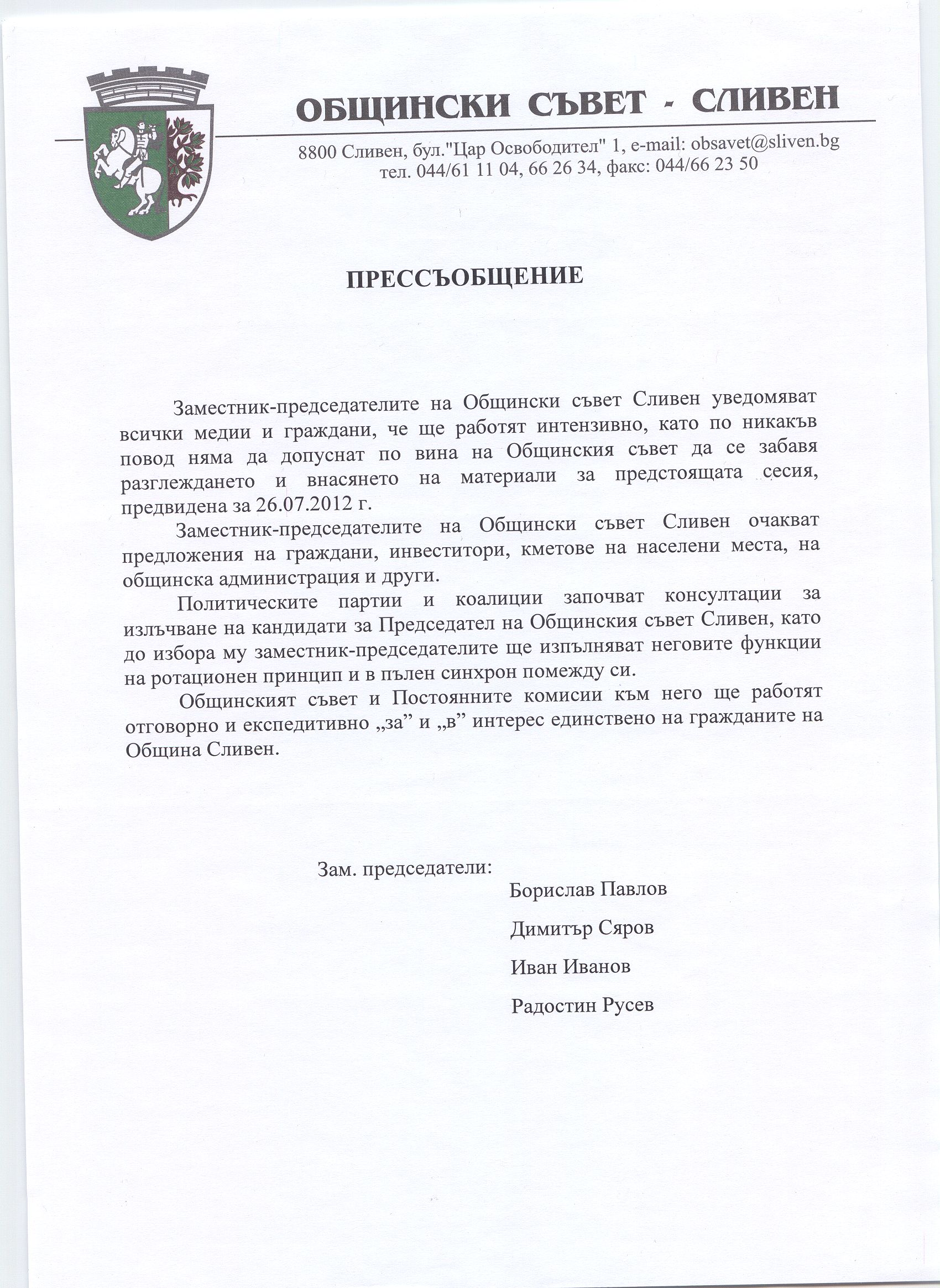 Днес, 03.07.2012 год., заместник председателите на Общински съвет Сливен проведоха заседание, след което излязоха с прессъобщение.